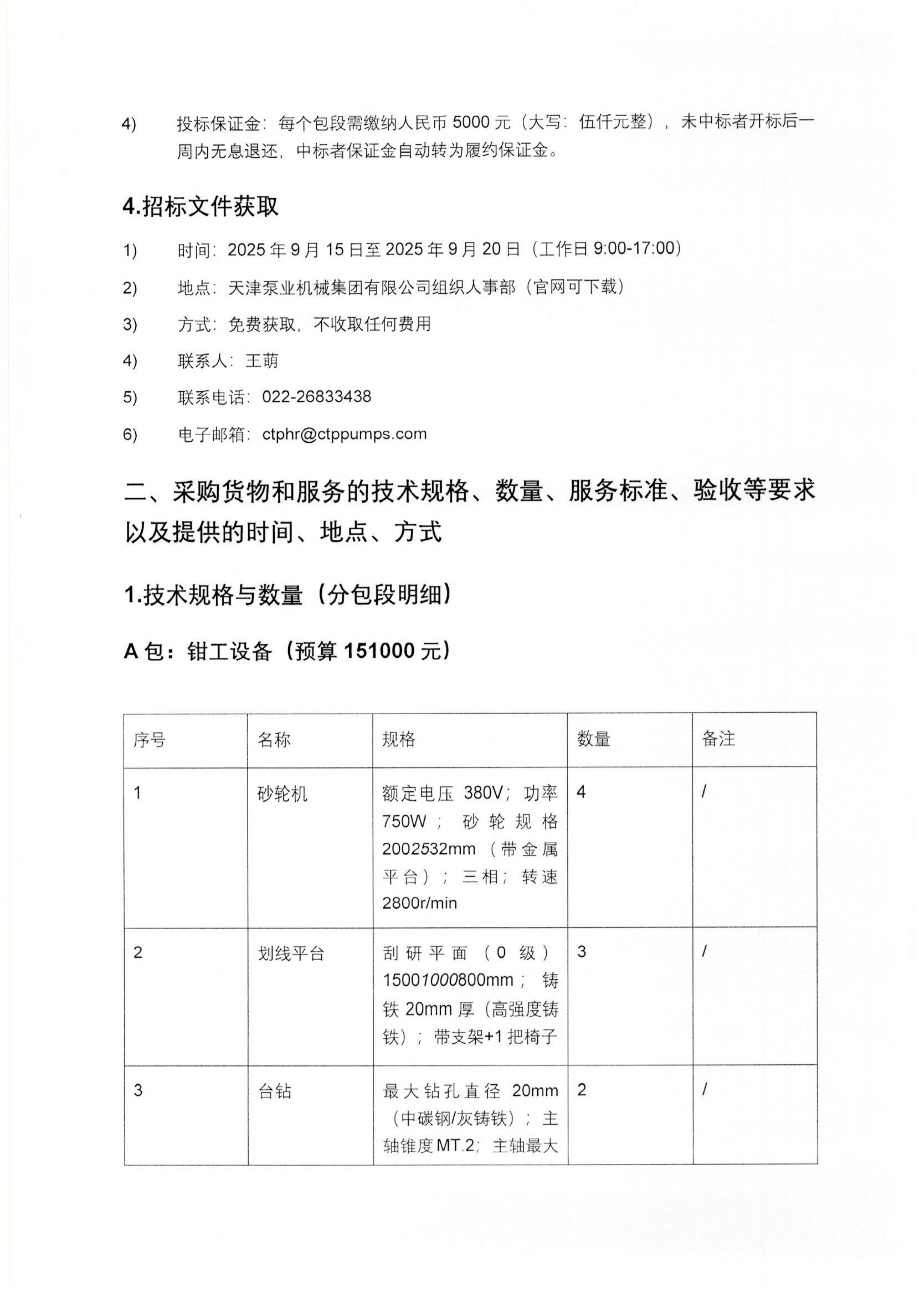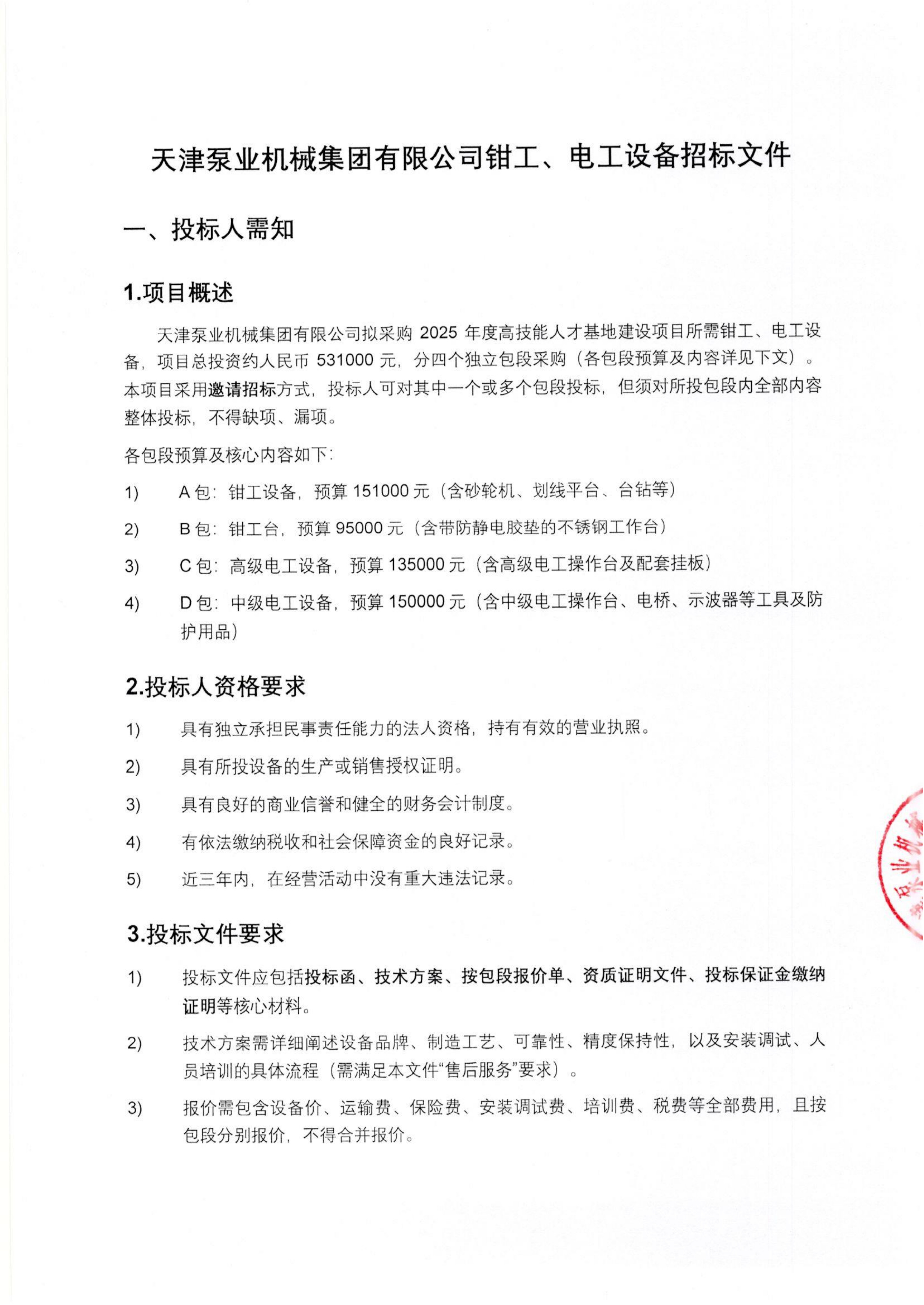 【概要描述】天津泵業機械集團有限公司擬采購 2025 年度高技能人才基地建設項目所需鉗工、電工設備,項目總投資約人民幣 531000 元,分四個獨立包段采購(各包段預算及內容詳見下文)本項目采用邀請招標方式,投標人可對其中一個或多個包段投標,但須對所投包段內全部內容整體投標,不得缺項、漏項。