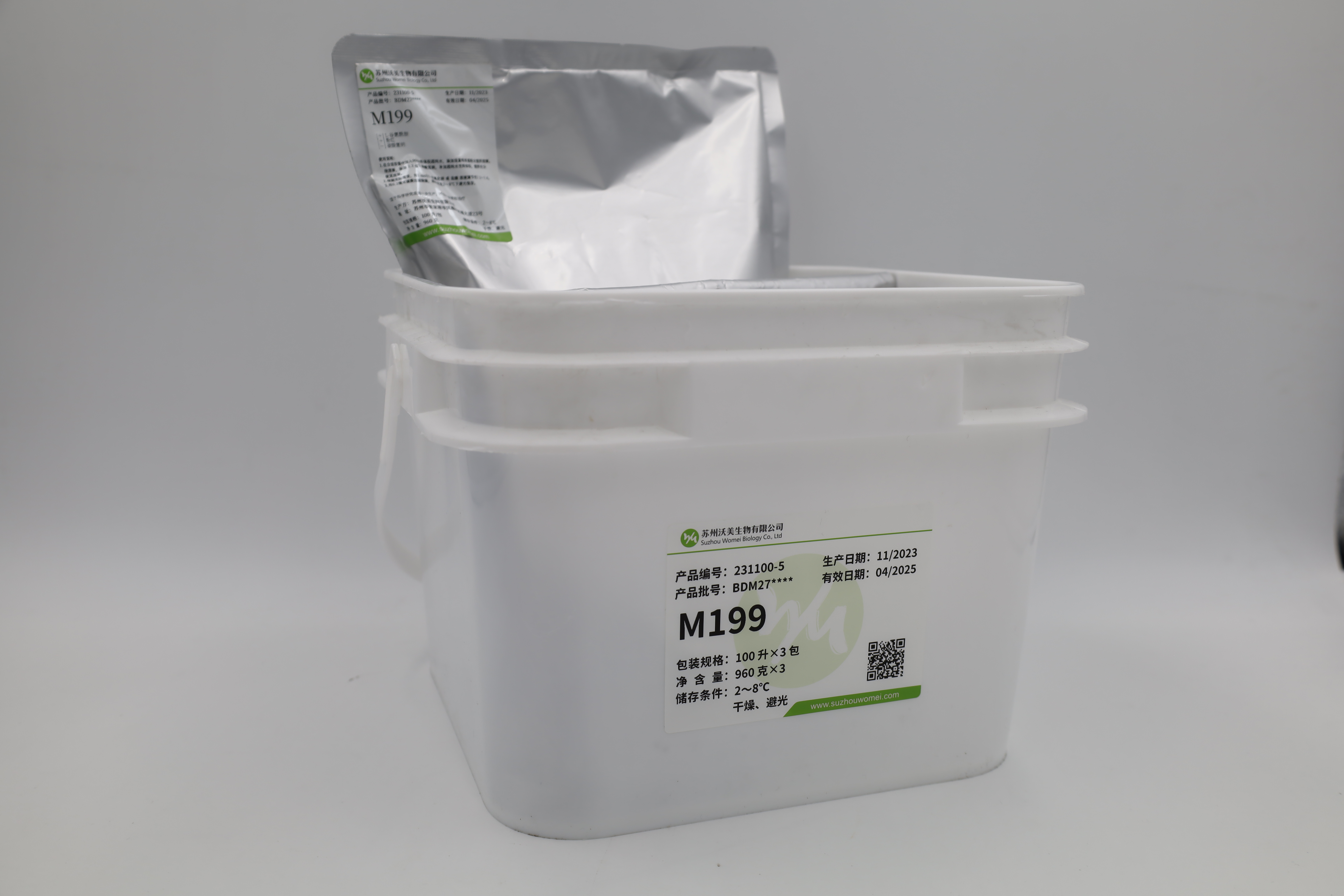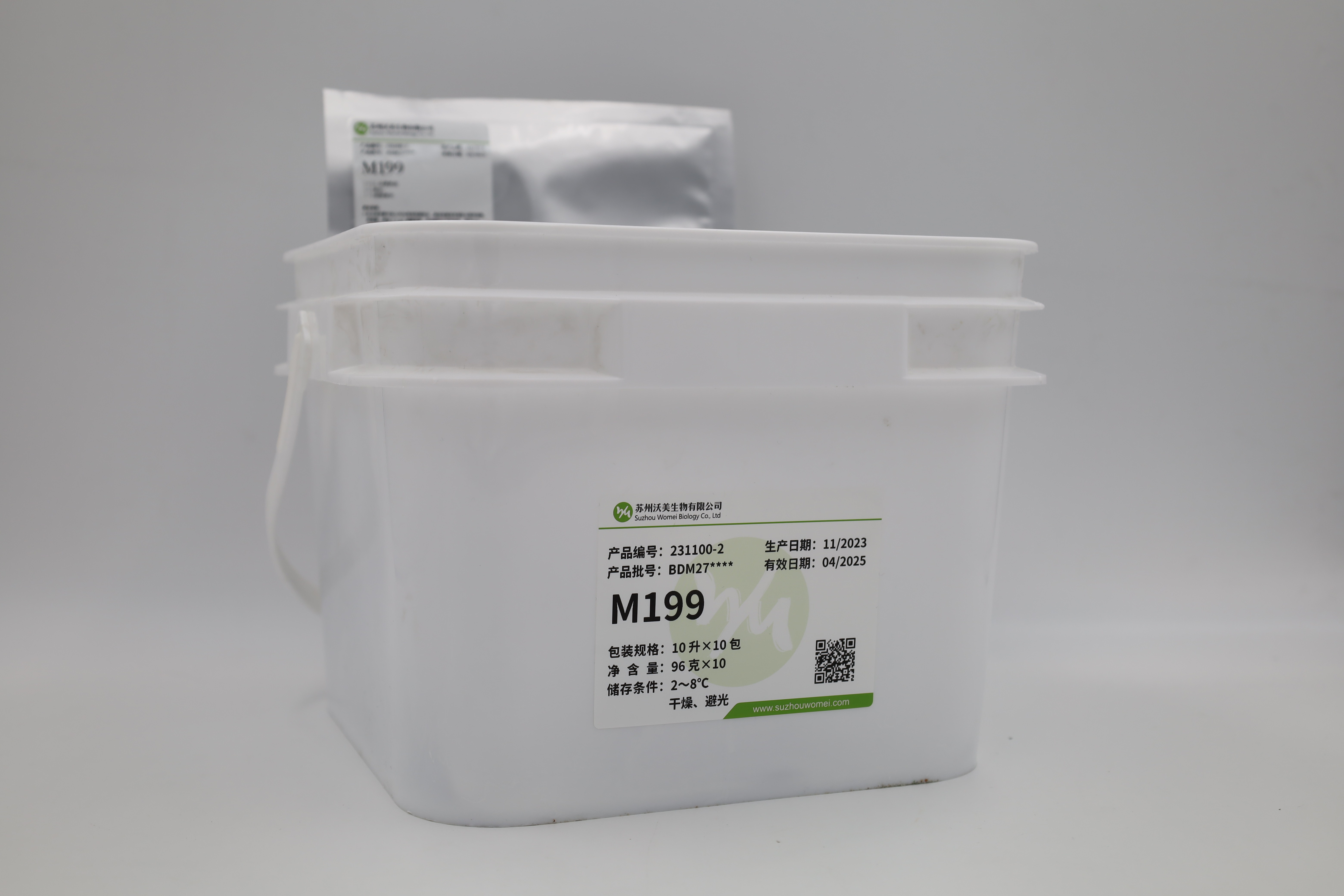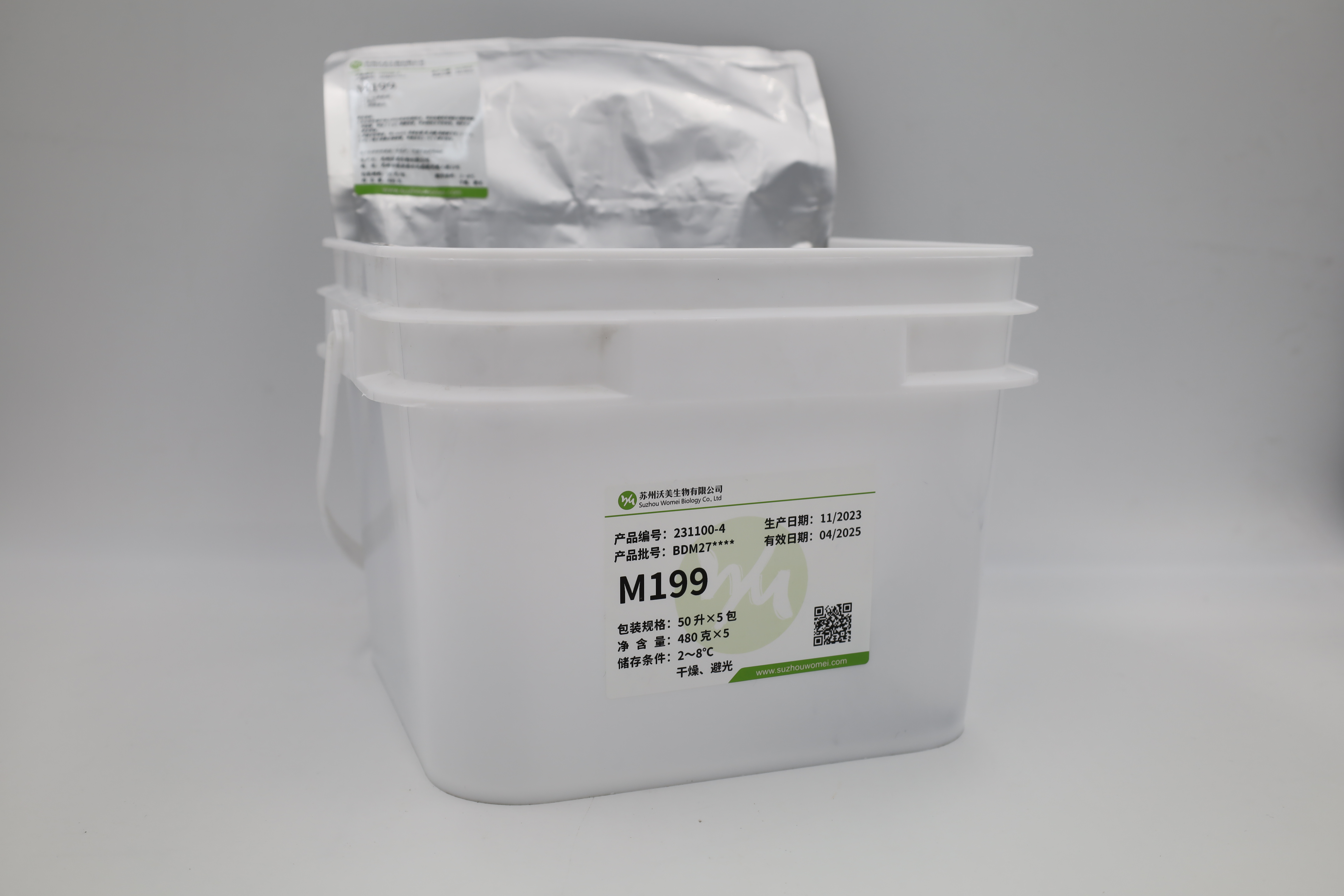 Medium 199,即培養基199, 是Morgan等在1950年設計的,最初用于雞胚成纖維細胞的營養研究,現已廣泛應用于各種動物細胞的培養,包括一些非哺乳類動物細胞。M199 特別適用于非轉化細胞的培養,也常用于病毒學研究,疫苗生產,以及大鼠胰腺.上皮細胞和小鼠晶狀體組織的培養。與其他基礎培養基相比,M199 含有獨特的成分,包括腺嘌呤、腺苷、次黃嘌呤、胸腺嘧啶、以及其他的維生素。